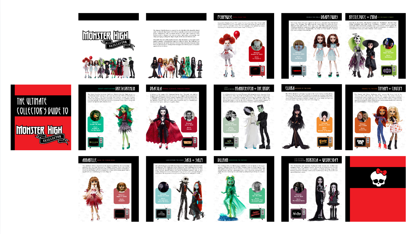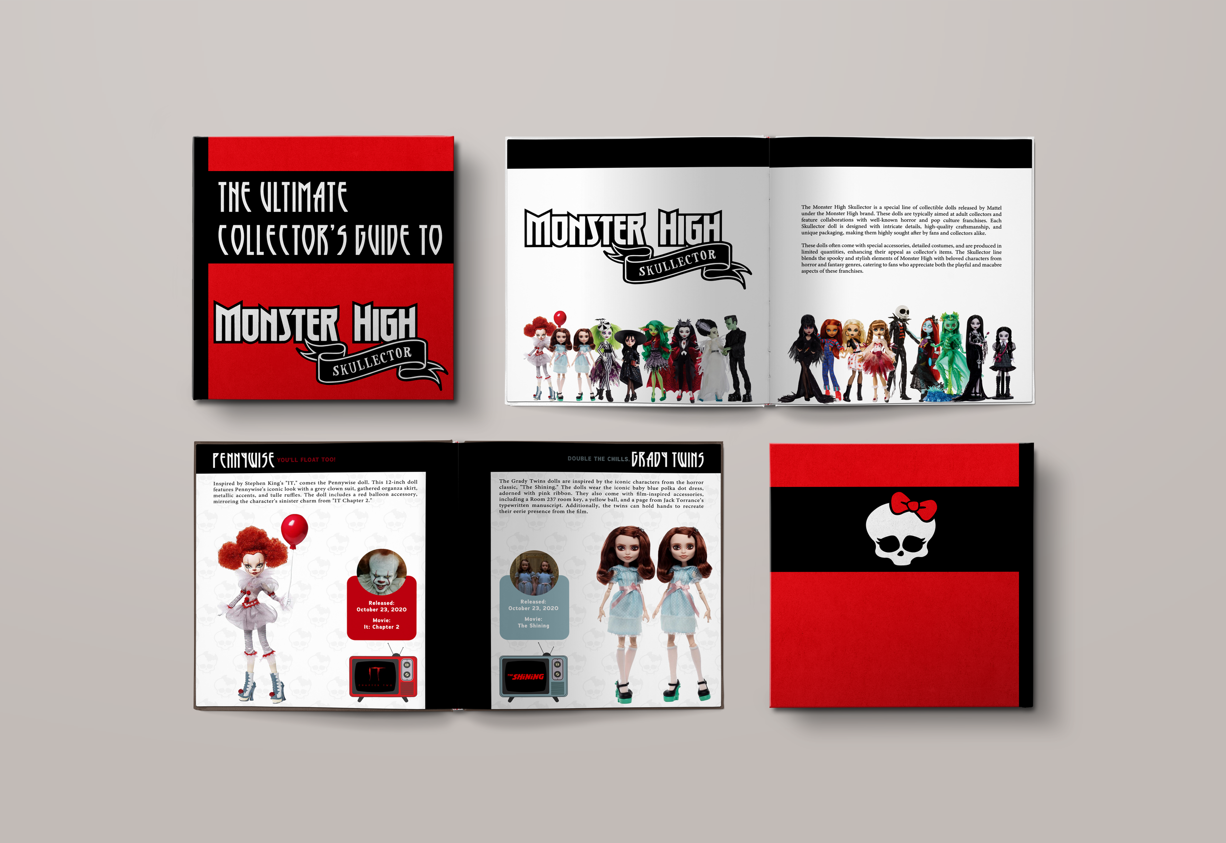 With this refresh, I created a new logo for their membership utilizing their style for their graphics, yet creating a new icon. This refresh also includes a member-exclusive package that each new member would receive once subscribing. This box features member-exclusive merch along, a custom doll, and an encyclopedia manual highlighting the brand’s Skullector Dolls. All of these items arrive in the exclusively made box.